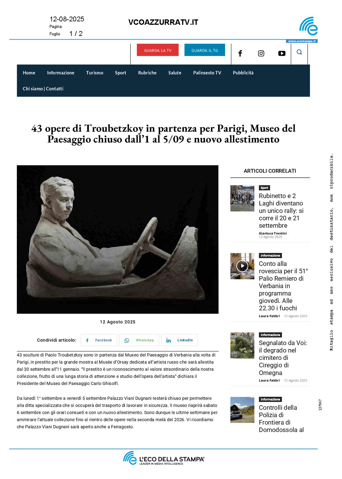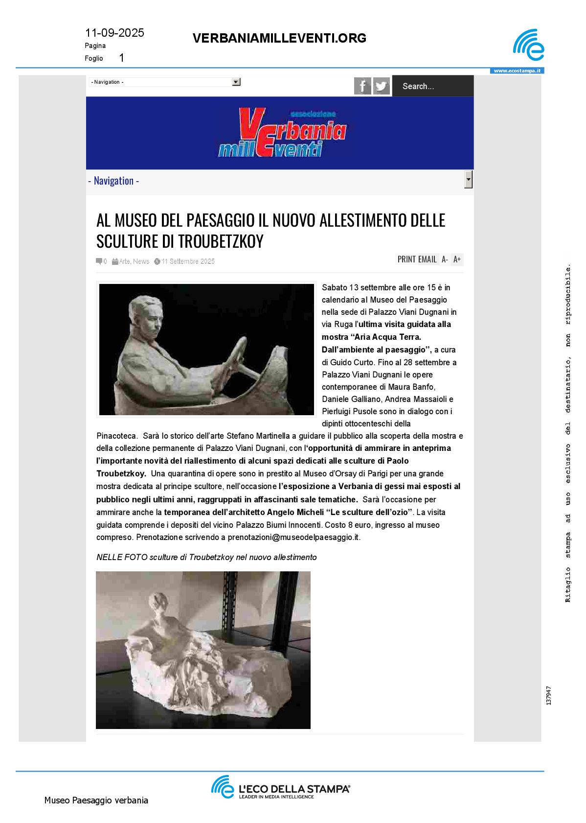 43 opere di Troubetzkoy in partenza per Parigi, Museo del Paesaggio chiuso dall’1 al 5/09 e nuovo allestimento